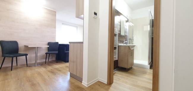 Vybavenie bytu: • kuchynská linka so spotrebičmi: elektrická rúra, varná doska, mikrovlnná rúra, rýchlovarná kanvica, automatická práčka, chladnička s mrazničkou, • jedálenský stôl so stoličkami, • obývacia časť s rozkladacím gaučom, šatníkovou skriňou, komodou a TV, • chodba s vešiakovou stenou, • murovaná kúpeľňa so sprchovým kútom a WC, • komora s úložným priestorom na potraviny, • bezpečnostné vstupné dvere.