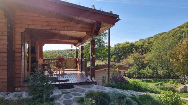 • Zrub (70 m²): postavený z kvalitnej arktickej borovice, zateplený ovčou vlnou, so zelenou strechou s miernym spádom. Má samostatné súpisné číslo, zapísaný ako rekreačná chata. • Dispozícia prízemia: prestrešená terasa, kuchyňa spojená s obývačkou, technická miestnosť, kúpeľňa so sprchou a suchým WC, dve izby. • Suterén: státie pre auto, sklad dreva, voľný priestor na ďalšie využitie. • Sauna: originál fínska saunová pec na drevo. • Domček (3 × 3 m): na stĺpikoch, s úložným priestorom pod domčekom. • Pivnica: vstavaná do zeme, dve oddelené miestnosti. • Chlebová pec: prekrytá strechou, s vedľajším skladom dreva. • Jazierka: okrasné, leknové a plávacie s hĺbkou 1,8 m. • Záhrada: úžitková záhrada s ovocnými stromami, skleníkom a nádržami na dažďovú vodu v zemi. • Energetická sebestačnosť: fotovoltický systém s 15 panelmi – napája čerpadlo aj ohrev vody. • Teplá voda: 100-litrový bojler napájaný elektrinou z fotovoltiky a výmenníkom z pece. • Kúrenie: krbová pec s výmenníkom a radiátormi, slúži aj na varenie a pečenie. • Internet: satelitný (parabola). • Voda: z vlastného vrtu – kvalitná pitná voda.
