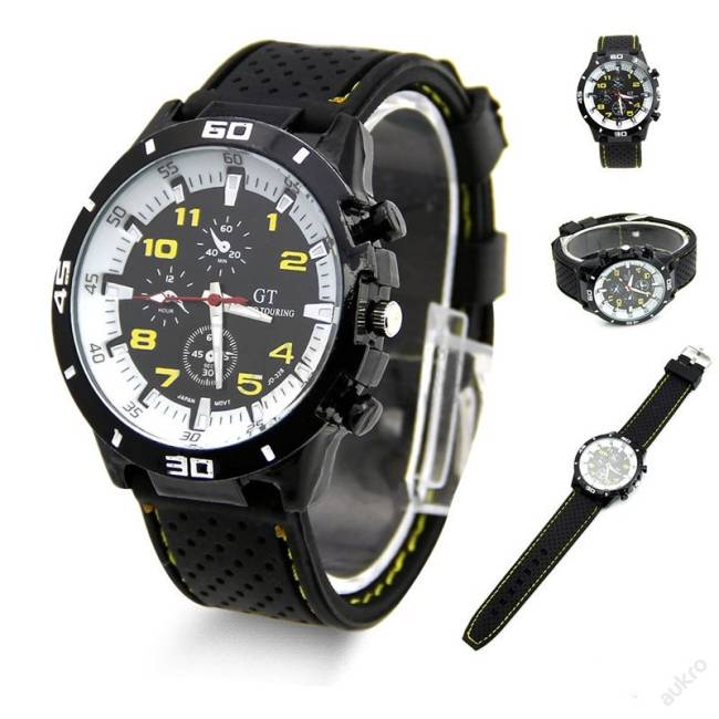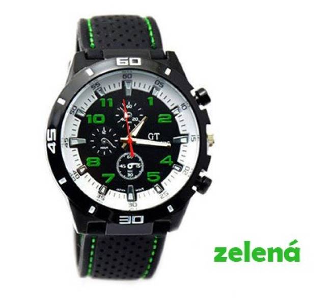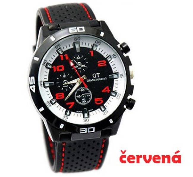 Pánske elegantné športové náramkové hodinky z nerezovej ocele Grand Touring sú určené pre elegantných mužov, ktorí zároveň preferujú športový a aktívny štýl. Quartz strojček, kvalitný silikónový zdobený remienok s príjemnou povrchovou úpravou SilkTouch dĺžky 24,5 cm s farebným vzorom na kraji remienka ladí s farebne značeným číselníkom v ciferníku priemeru 2,2 cm. Remienok má klasické upínanie cez kovovú sponu, pomocou dierok si potom môžete zvoliť, aká dĺžka opasku vám vyhovuje najviac. Tvrdené minerálne sklíčko. Japonský quartz strojček. Vhodné pre každodenné použitie pri rôznych voľnočasových a vnútorných aktivitách, ako sú obchodné rokovania, večierky, nákupy atď. Je to perfektný darček k narodeninám pre priateľov, kolegov alebo otcov. Dostupné farby: červená, žltá, zelená, bielo-modrá Priemer ciferníka: 4,3 cm Šírka remienka: 2,1 cm a dĺžka remienka: 24,5 cm Váha 50 g