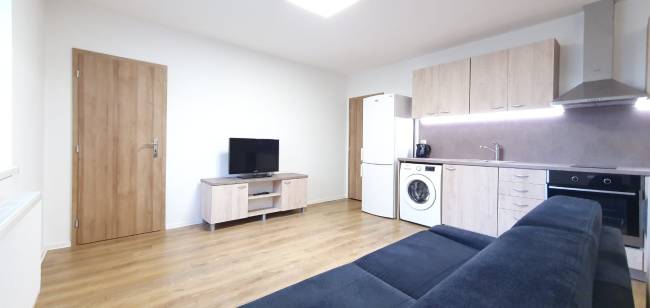 Vybavenie bytu: • kuchynská linka so spotrebičmi: elektrická rúra, varná doska, mikrovlnná rúra, rýchlovarná kanvica, automatická práčka, chladnička s mrazničkou, • jedálenský stôl so stoličkami, • obývacia časť s rozkladacím gaučom, šatníkovou skriňou, komodou a TV, • chodba s vešiakovou stenou, • murovaná kúpeľňa so sprchovým kútom a WC, • komora s úložným priestorom na potraviny, • bezpečnostné vstupné dvere.