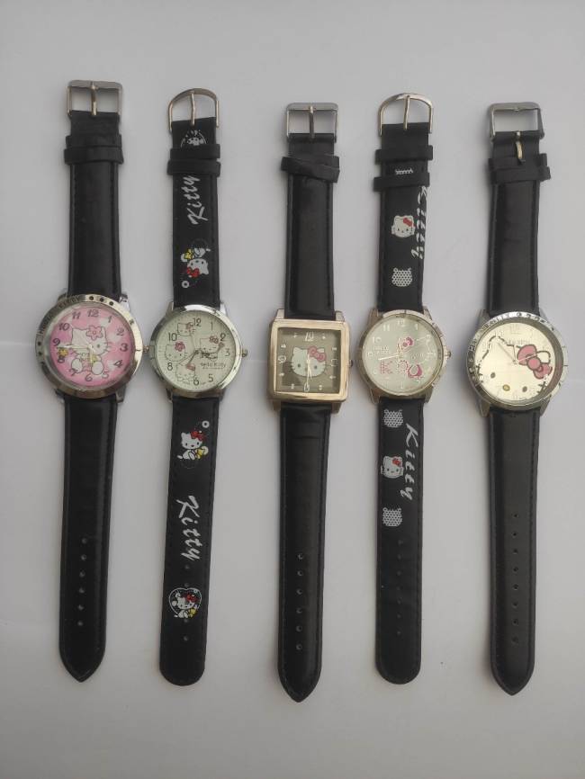 Predám elegantné Hello Kitty hodinky pre slečny a dámy v čiernej farbe. Tradičný aj netradičný tvar ciferníka obsahuje rôzne obrazce Hello Kitty vo vnútri ciferníka. Ciferník zdobený lesklými kamienkami. Remienok čierny a zdobený dĺžky 23,5 cm je nastaviteľný aj na iný rozmer, cena už od 3 € !